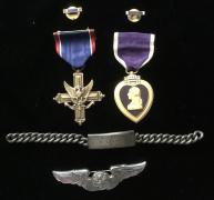This Air Service Bracelet has been in my collection since November 1980. The bracelet consist of one Silver French Coin that had been filed clean on the named side and includes Six miniature medals/medallions. The Bracelet is named to M. A. STEVENS / A.E.F. / AIR SERVICE. One or an miniatures is a C ...Read and See More