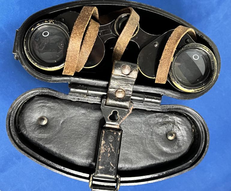 This is a neat combination of a WWI production Carl Zeiss, Marineglas in a WWII Bakelite case. This set was brought home by a US Soldier. The glasses are marked Carl Zeiss Juna on one side and marineglas 506310 6X. The exterior original paint would rate in the high 90%. The artificial black leather wrap is complete. The eye shades are complete the individual focusing of each lens works. The glass is clear no fogging or gray areas.The right hand lens has the horizontal grid markings. Again the glasses are clear with no problems. There also is a attached rain cover for the lens. The Bakelite carrying case is the normal black red finish. The front draw catch is complete with the leather pull strap. There is a small circular stamp on the bottom of the case but I cannot read it. The two leather? straps for mounting on the belt are separated by the rear hinge. One strap has a Waffen amp if you look real close I think its neat having the old binoculars with the new WWII case.