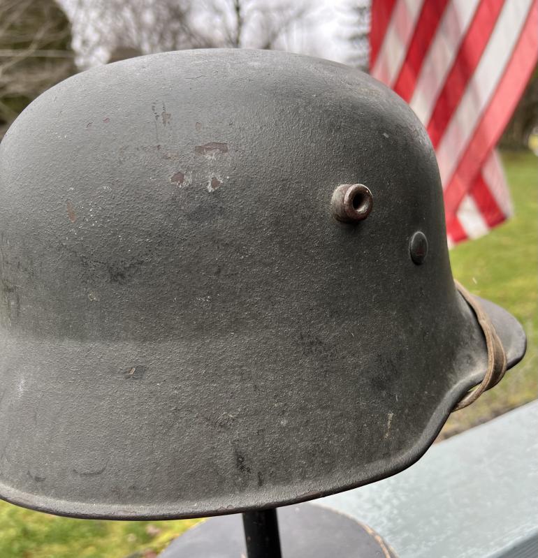 If I still collected German Helmets this one would be on my shelf. Its that nice!This Q68 Helmet has around 95+ of the original paint. The paint loss is around the lip of the helmet. The decal would rate 100%. The liner is complete but the draw string is present but has been broken over the years. The rivets are original along with the correct washers. Just noticed there is a 1" area on the edge of the leather liner that some mouse must have eater. The chin strap is also complete but the very end of the strap is missing. This is a great hard to find large size Trans SD helmet and would look great on anyone's shelf.