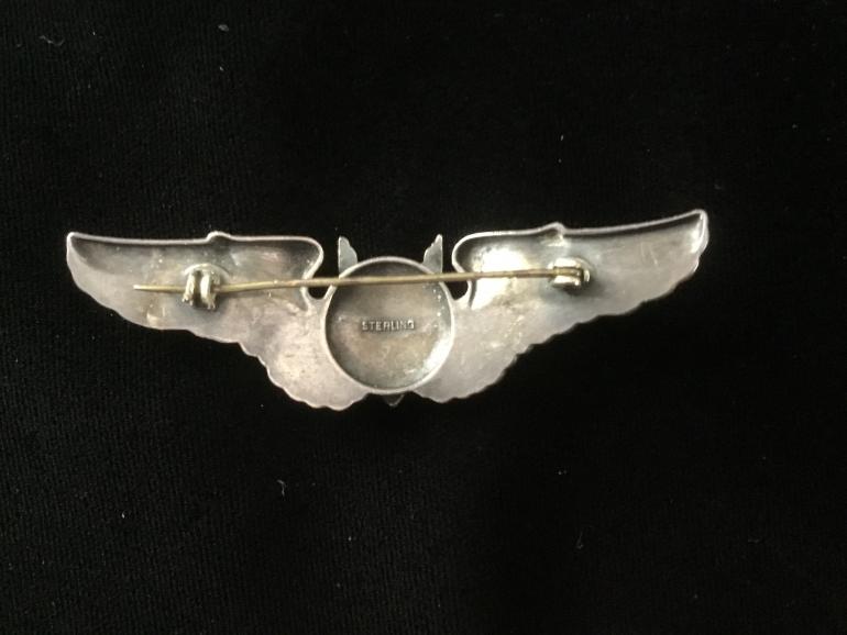 This 3" Gunners Wing is made of Sterling and has a pin back attachment. The safety lever is missing from the catch. The Wings have been bent back to give the center Gunners insignia a protruding place and really catches the eye.