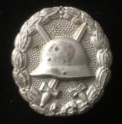 This Silver Wound Badge is an early mfg. the catch is a part of the original stamping that is bent and shaped as a hook. On the flat section it is stamped DRGM. The badge shows wear.