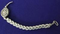 This second Model First Class Shooting Lanyard was instituted in 1938 with just the replacement of a new shield on the rosette. This is a used lanyard but shows little wear. The cloth baking on the Rosette has moth damage but shows three letters in white marking.