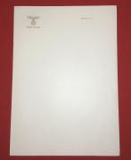This double sheet of personal stationary for ADOLF HITLER has the National Eagle and A.H. In raised Gold lettering on the upper left side and on the upper right corner has the BERLIN, den, also in raised gold lettering. The stationary measures 8 1/8”wide by 11.5” high. This is the double sheet ...Read and See More