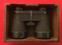 This small military binoculars appears to have a line character impressed into the top lenses bar. There is a serial number 89740 stamped into the dome receptible for the adjustment screw. The wood case is dove tailed on the corners and the binoculars just fit into it. The best part is the lenses ar ...Read and See More