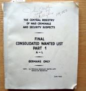 This two book set listing of the Central Registry of German War Criminals and Security Suspects is dated June 1946. The cover also list that this is the Final Copy and that all previous copies are to be destroyed. This paper back set list over 28,000 wanted German suspects for various crimes inclu ...Read and See More