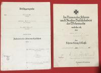 This is a pair of Documents to gefreiten Arthur Muller for the following. A-Infantry Assault Badge in Silver dated October 15th 1941 listing 10. Inf. 14, signed by a OberestLeutanant. B- Iron Cross 2nd. Class OGefr. Muller 10. /J.R. 14 Generalmajor U.Div.Kommandeur (ink stamp). The ircular stamp I a ...Read and See More