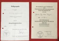 Documents include A-Winter Campaign Russia awarded Sept. 24, 1942 Gefriten Fritz Stroppel Stabskp. B- Tank Battle Badge Silver. To Gefreiten Fritz Stroppel Stabskp. II./ Panzer-Rgt. 6. Circular stamp on lower left of the document list Panzer Regiment 6.