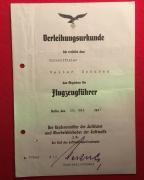 This is just a nice group with 1 A pilots certificate to unteroffizier Walter Schuran dated May 15, 1941. 2 A internal file note from the training management from the Flieger Ausbildungsregiment 52 stating that Sergeant Walter Schuran is in possession of the aviation license no. 187/41 signed by the ...Read and See More