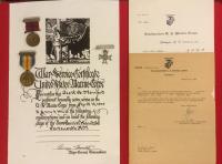 This is just a great Good Conduct Medal group it includes his Good Conduct Medal, a neat WW1 Victory Medal with a U.S. Marines bar added to the top of the ribbon, pristine Sharpshooter badge with his initials scraped in the back of the cross, His War Service Certificate, the headquarters certificate ...Read and See More