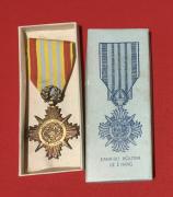 This Viet Nam made second class Honor Medal is in the original box. The manufacturers name and Saigon address and logo is printed on the inside of the cover. The French style mounting pins is missing.