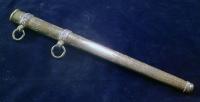 This is the steel brass plated scabbard with the lightning bolt pattern. The two screws are missing that hold the throat in. Right now I put some tape on the throat to hold it in the scabbard. So if you have the two screws and need a scabbard here it is. Condition late war good. ...Read and See More
