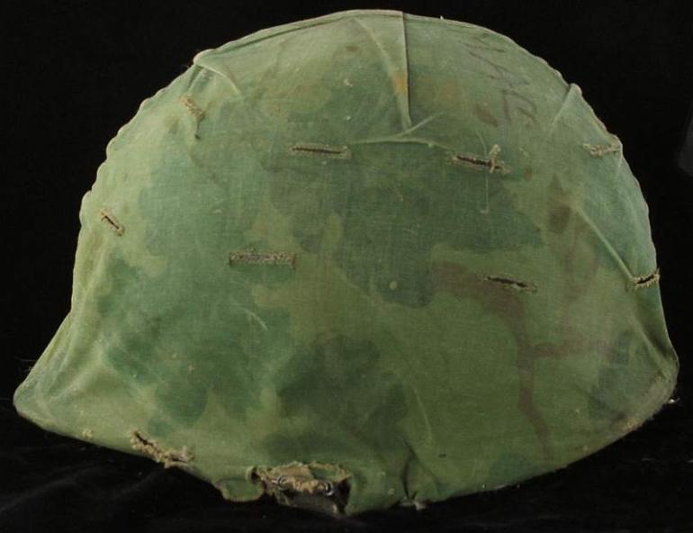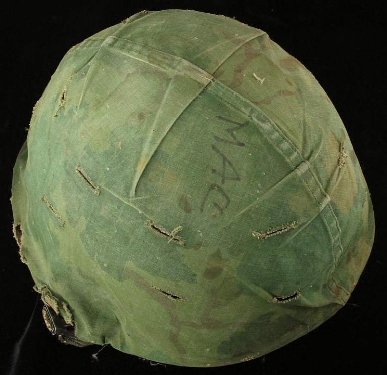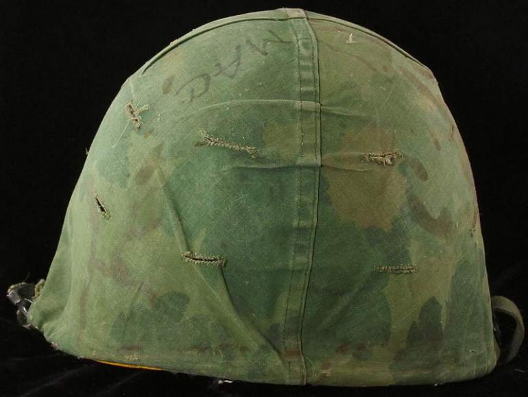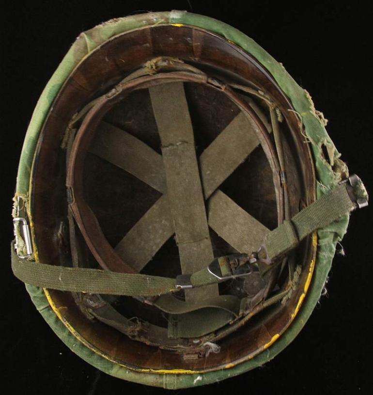 This is my helmet I bought out of my shop years ago from the grandchild of the vet. They did not want it and I was thrilled to have it walk in, it has a lot of personality. It is funny because years ago no-one cared about US helmets, now they are hot! This cover has the absolute look it was there which really makes it and has Mac's name written on it hence why it is called a graffiti helmet. For whatever reason the outer shell of the liner is yellow, I have had several helmets like this over the years. I was told by a vet one time he was directing traffic which is why he wore his liner and it was painted white, I am sure there is a reason for this too. The liner is fine and again, it has a lot of character!