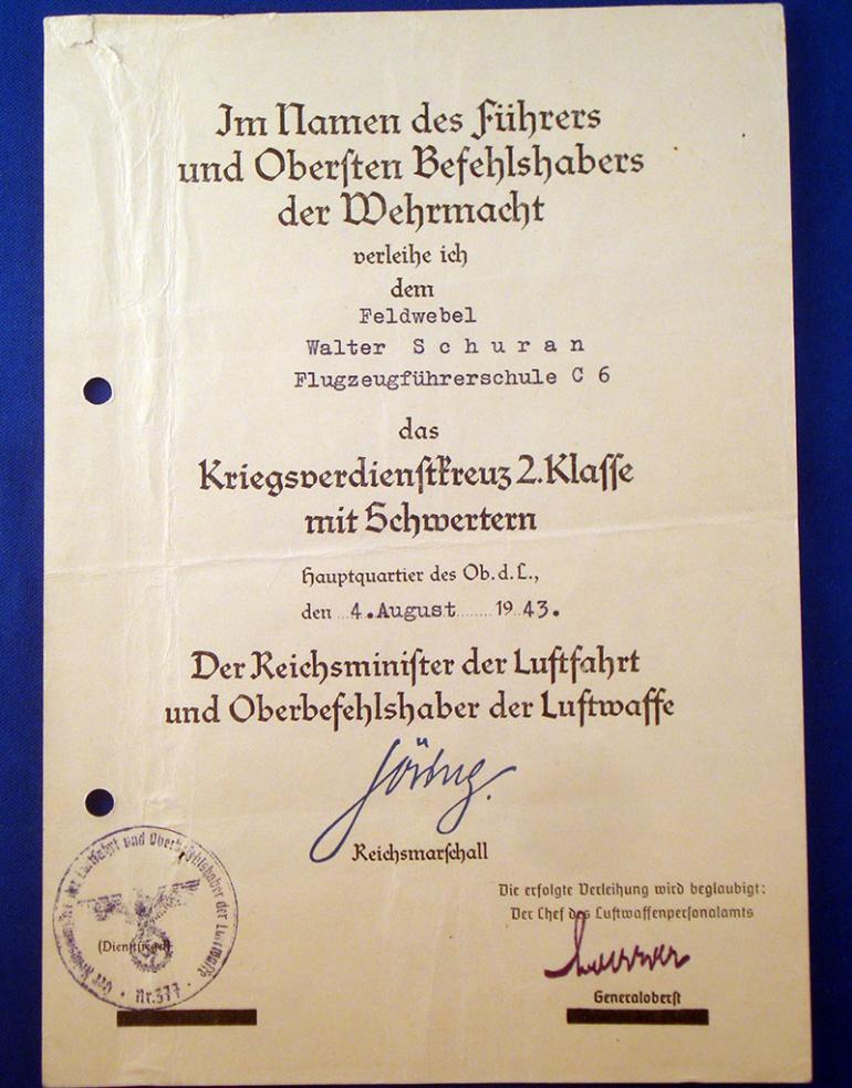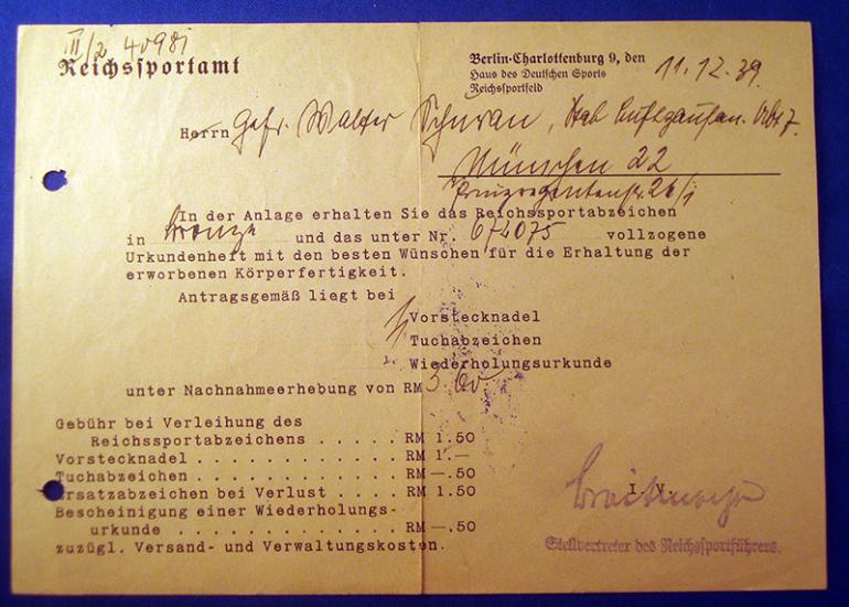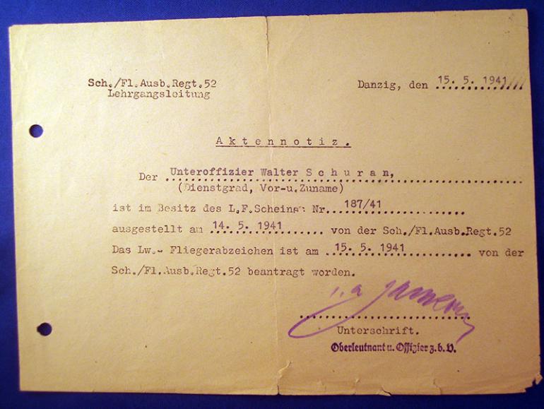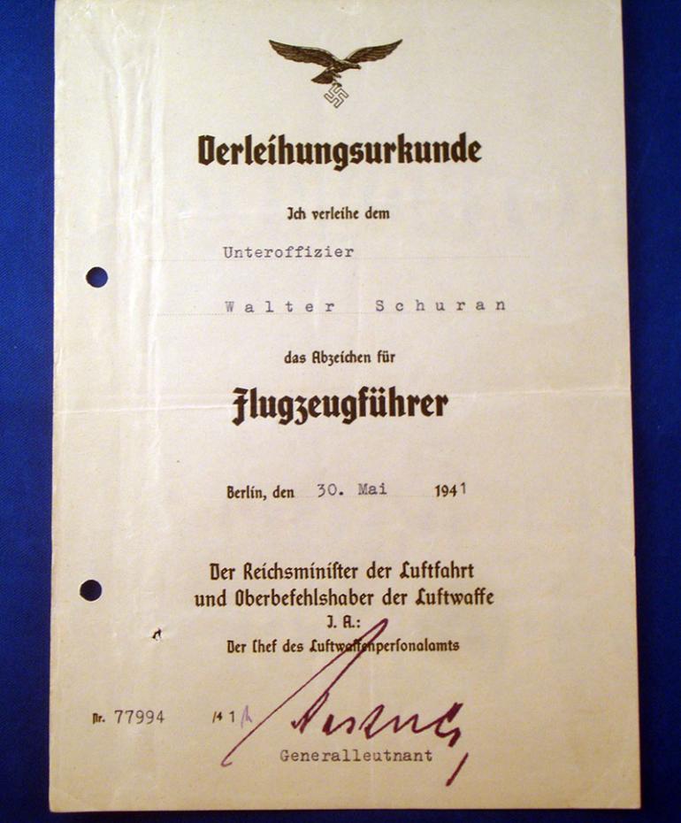 1- Transmittal Document dated 12,11,1939 to Gefreiter Walter Schuran for his Reich Sports Badge in Bronze and listing what the badge will cost him to buy. 2- His pilots license from flight school dated May 15, 1941 to Unteroffizier Walter Schuran. 3- Pilot badge certificate to Unteroffizier Walter Schuran dated May 30, 1941 4- Iron Cross 2nd class certificate to Feldwebel Walter Schuran I have not tried to do any research o him just don't have the time. Condition very good +