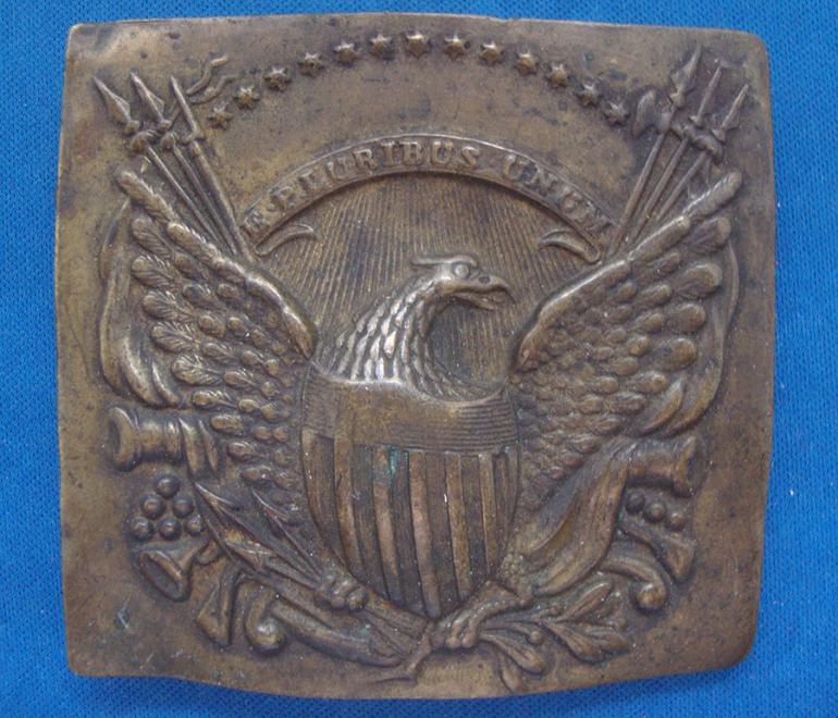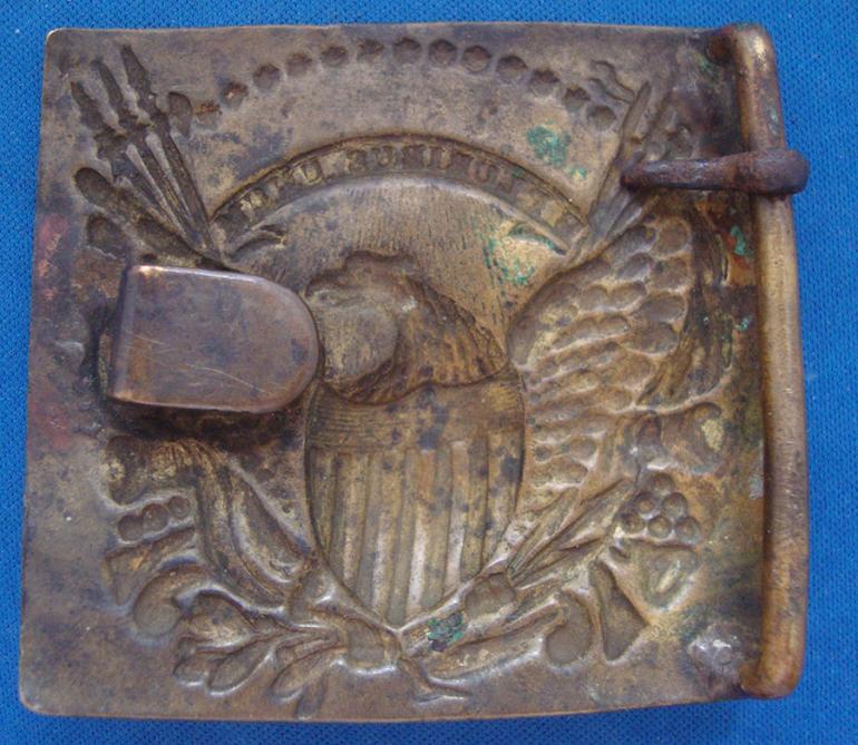 I purchased two of these buckles some time ago for my personal collection. I just love this style buckle width he large American eagle embossed on it. This is the larger of this eagle style measuring 2 5/8" wide by 2 1/2" high. It had taken me years to get these two in this condition. The belt bar and catch are present including one belt hook. Rare Condition +++
