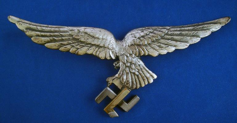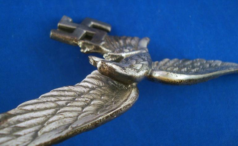 I have always liked desk ornaments and this has been on my desk and my shelf of Luft helmets. This Luft eagle was taken off something as the lower Swaz arm shows where it was twisted off its former ornament, and shows stress marks. The eagle is 7" wide by 3" high and made of non-ferrous medal. Its solid and nice and heavy to hold papers down. The body and eagle head project from the wings just a great looker. The wings have lines for the feathers this is not a cheaply made eagle. Condition very good