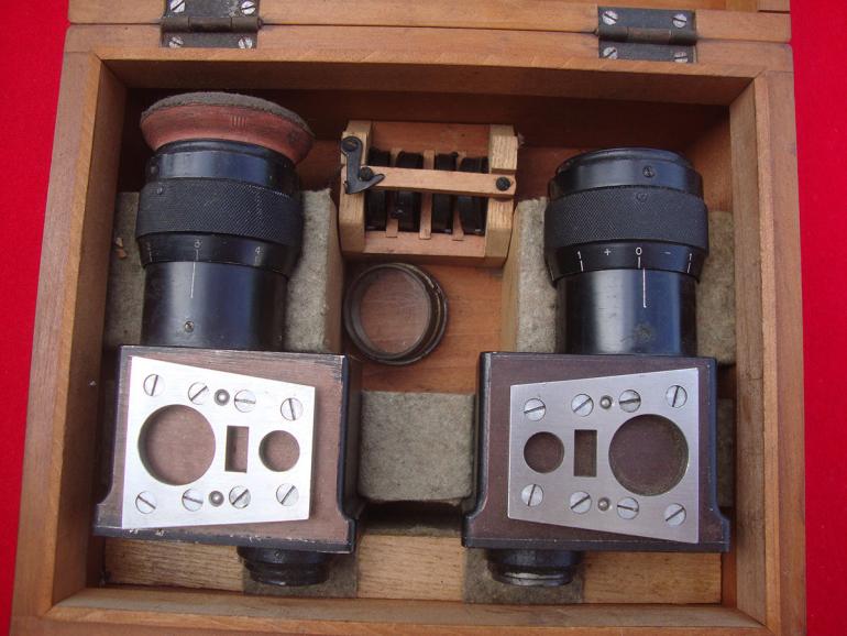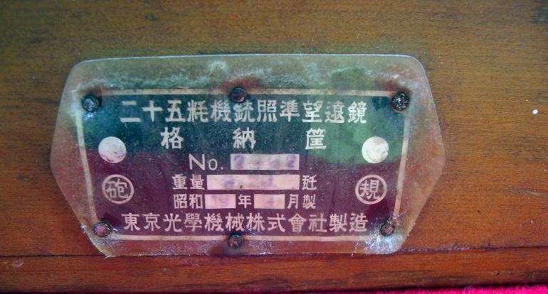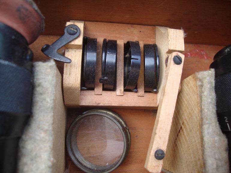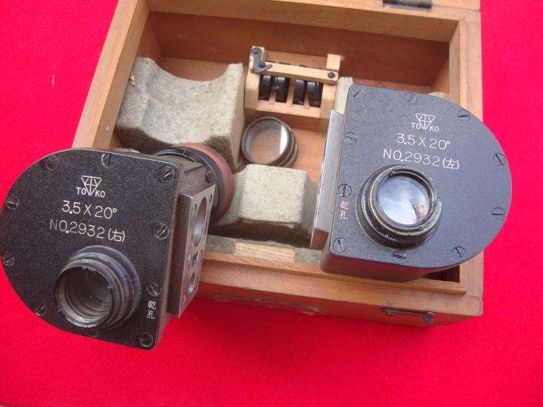 This set of optics for the 25MM Type 96 Anti Aircraft Automatic Cannon is from my collection originally purchased in Oct. 1990. I have been collecting Military Optics for quite a few years sometimes I did not even know what I was buying but if it was neat and the optics were good it went into my collection. This pair of optics (one was used on each side of the mount) are clear and one has lines and ovals for ranging and deflection. The case is complete with the original tag on the front, and the rope carrying handle. Inside the box are the padded cradles for the optics and there are two sets of two filter lenses. There also is another lenses with the lines and ovals laying on the bottom of the case. The optics themselves are clean and fully functioning. Condition very good +++