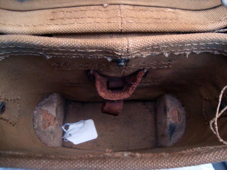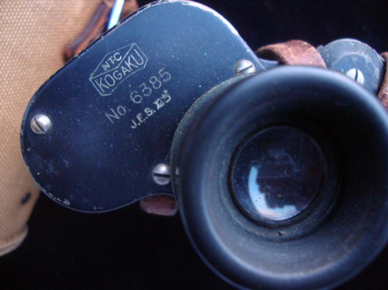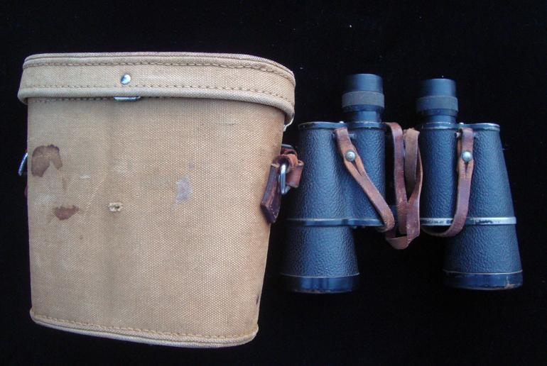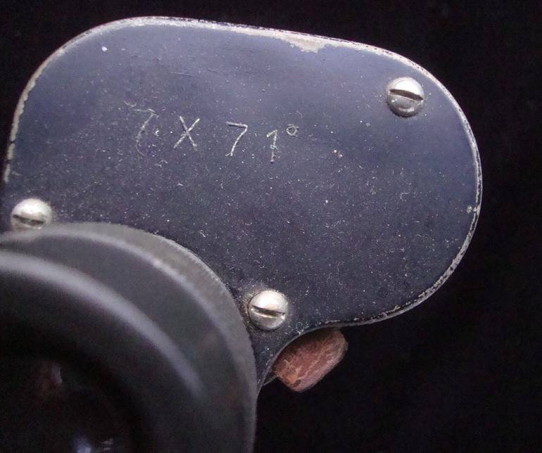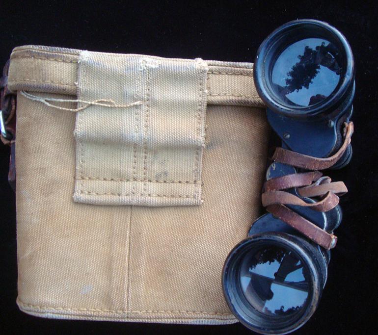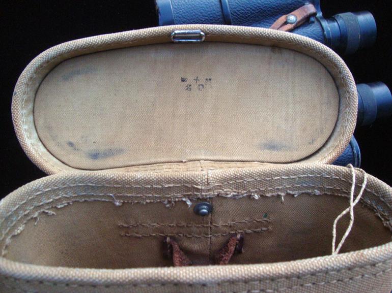 This set of Japanese binoculars are from my optic collection, and are made by Enomoto Kogaku and are pre Fuji so they are pre 1944 mfg. The binoculars come with the original neck strap and the canvas carrying case. The case has part of the adjusting leather strap on one side. There are some marking on the inside top of the case?. The right hand lenses has artillery adjusting grids for horizontal and vertical adjustments. The binoculars them self are fully covered in the pebble simulated leather. Both eyepieces adjust and there is one small black spot on the left lenses. Condition very good