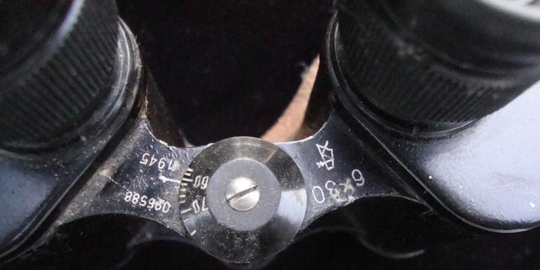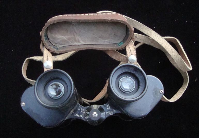 This set comes from my optic collection purchased in Dec 1996. This binocular set by the Komz factory has the code factory mfg on the axis of the binoculars as opposed to the flat top of the lenses housing, and it also lacks the hammer and cycle. The binoculars are dated 1945, serial no.095588. The exterior of the binoculars is in great shape including the original carrying strap and the lenses protection leather cap. The right lenses is clear but does not have any ranging grid markings, the left lenses is cloudy. The typical Russian case is complete with the carrying strap and inside are two sun lenses and one extra eye relief cap. Condition very good+++