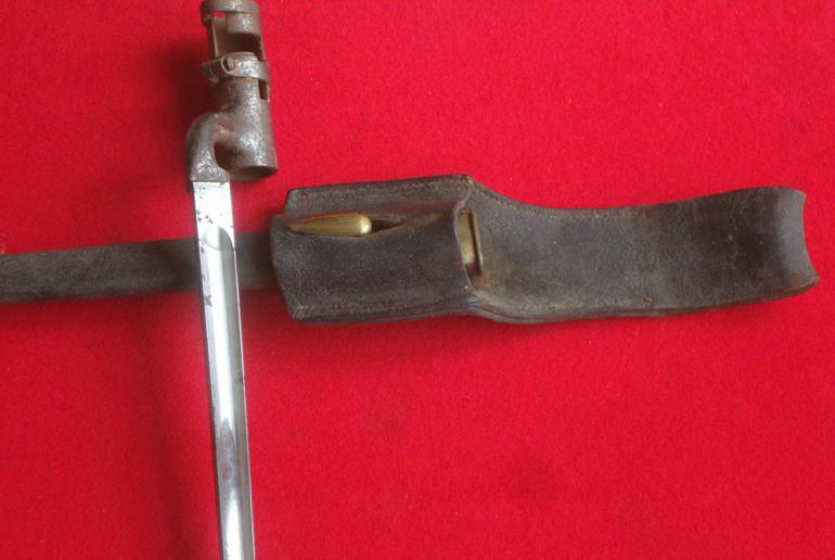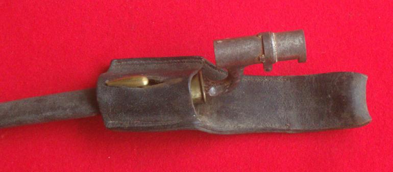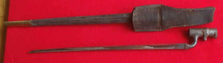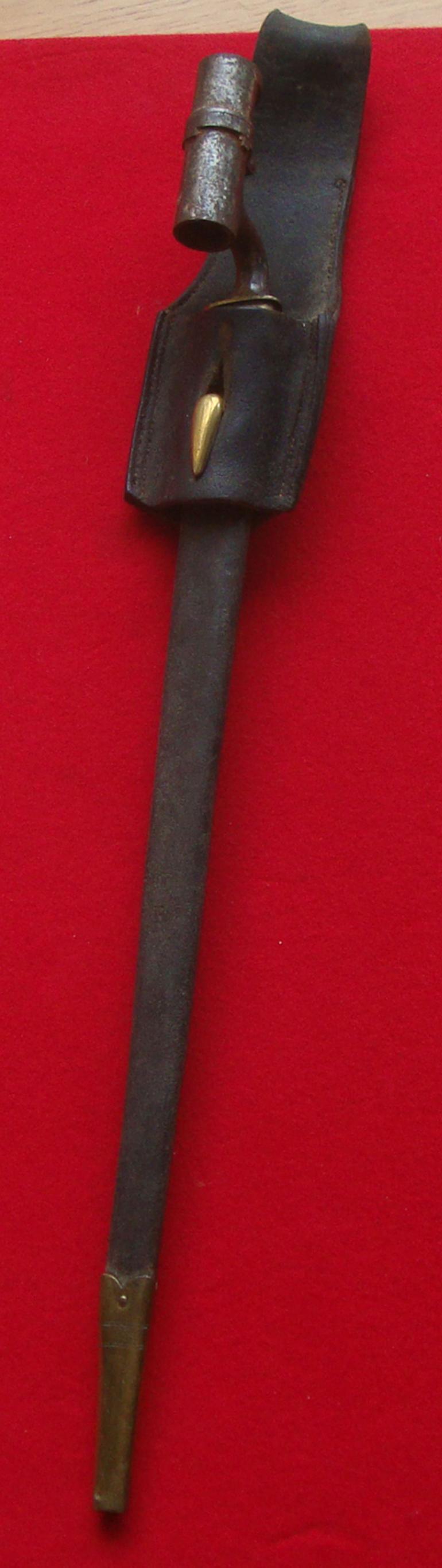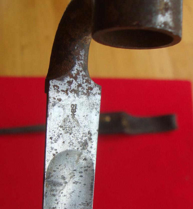 I have to start this off by saying maybe it is not English? not my field of collection but just thought it was in good condition and I normally do not see early bayonets with the belt hanger so I bought it. Now you guys can tell me what I bought and if I paid too much for it. So here goes the description the Blade is Three sided and 17" long marked with a crown with a 10 under it and something stamped above the crown I did not see a broad arrow proof mark but I do not know when that went into effect with GB.The blade is bright with some surface rust and black marks. The scabbard leather is complete with the stitching intact the drag and throat are complete. The leather hanger has the letter B stamped on the reverse and the number 3 a smaller 3 is stamped on the lower portion of the hanger. Condition very good