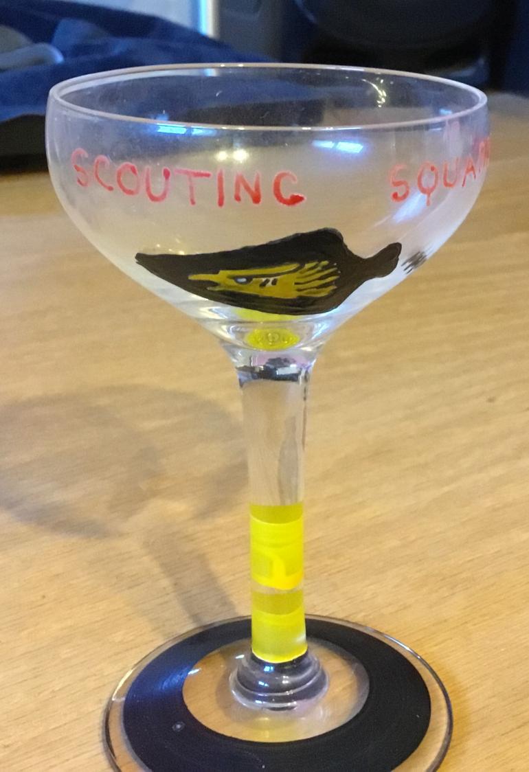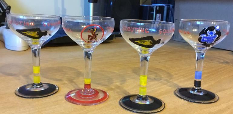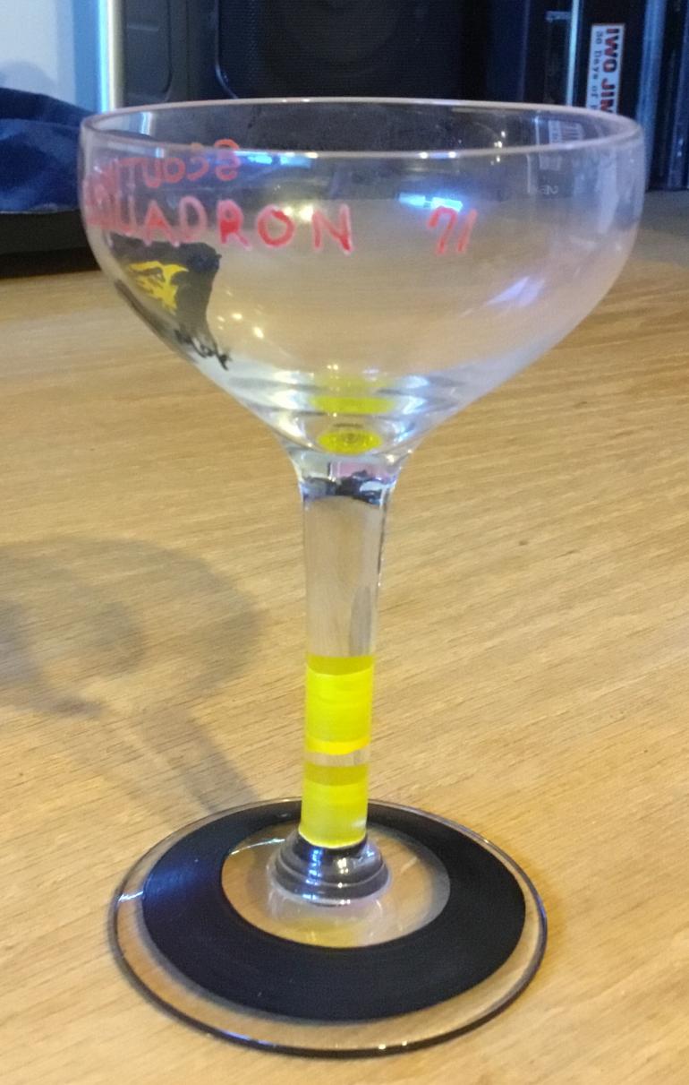 Anyways what we have here are 25 professionally painted glasses for after dinner drinks, cordials. There the following aircraft carriers painted on an individual glass. A - USS YORKTOWN B - USS LEXINGTON C - USS RANGER D - USS LANGLEY. Each individual glass has the ships name the ship's logo on the bowl and the ships color on the base. The remaining 21 are completed the same way except that they are for various air squadrons Again with the name of the unit the painted logo and the planes inentify color. Examples are fighting squadron 42 with a black bird with what looks like a wheel on his feet, with a red and black stem and black base. Next Marine Scouting Squadron 3, with the name and logo painted on the bowl. The logo is a shield and what looks like a winged person on it with red & yellow top of the shield. The stem is painted red and white with the base painted black. The third example is for the Scouting Squadron 72 with the name and logo painted on the bowl. The logo is a bat hugging the earth, really neat. The stem is painted yellow and light blue. The base is painted yellow. This is a great partial collection and I wonder if it was broken up at some point between various officers. Explanation when I say painted on the stem it refers to the two 3/8" circle painted around the stem. The base paint is a 1/2" circle painted around it. I have never seen anything like these glasses before and have to presume the time it took to make them must have made them expensive items for the upper tier of officers like an admirals mess. Condition 24 ea excellent one broken and taped together