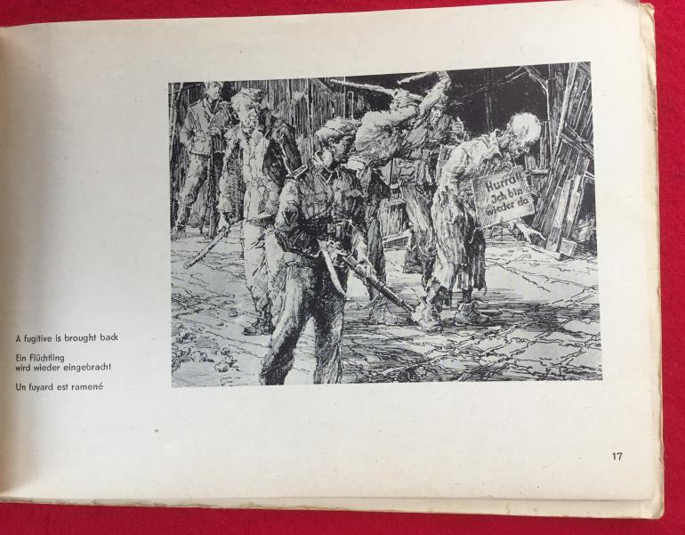 I have never seen this paperback book before on Dachau before it is 6" high & 8 1/2" wide. The text is in English German and French. The book consist of 65 pages with a overlay of the camp in the rear of the book. The book describes the daily life of a prisoner in the three languages. There is also a colored chart showing the prisoner identification patches. Condition low good