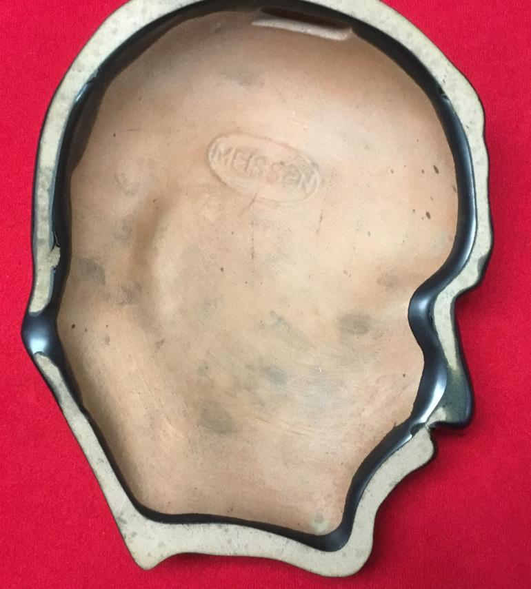 This three demenshial head is just a great lookin in the dark gray/brown finish. The glaze is heavely applied and ground off the back to lay flat on the wall. The Meissen stamp in the reverse is in a oval. Not much to say about the subject but I am sure he was in manny houses. Height 9" x width 6 3/4". Condition like new