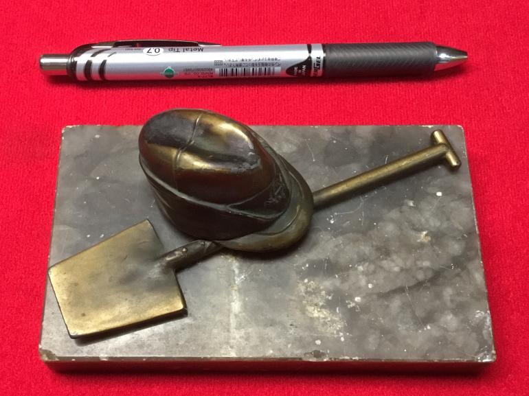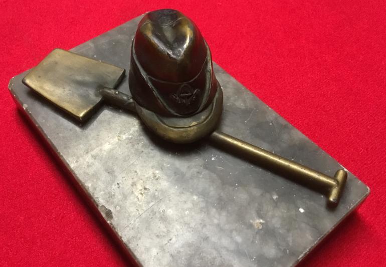 I have had this for a while a very nice RAD ornament that is 5" wide and 3" high. The Robbin Hood cap has the RAD insignia with a poor swaz in the design. The shovel even has the rivets to hold it to the wood shaft. The cap and shovel are pined to the marble and one pin is broken off. The C & S can easily be removed. The underside of the marble still has a partial sales tag on it. Condition very good
