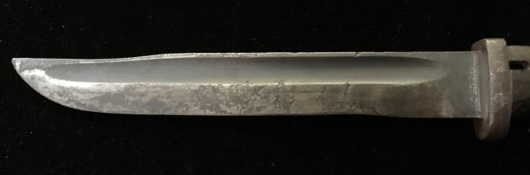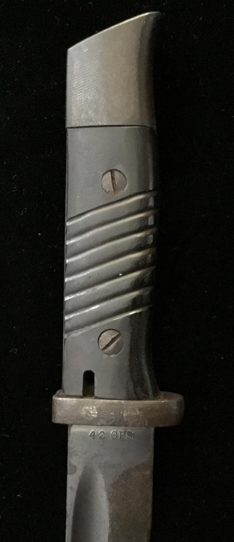 This K98 Bayonet came from an old time collection and started out life as a regular Paul Weyersburg bayonet but has seen extensive modification to transform it into a fighting knife. The most striking modification is the grinding of the pommel down to a slanted angle that really fits the hand nicely. There is a waffen amp stamp on the top by the slot cutout. The grips have been filed down to better match the tang with no overhang on the bottom and with a slight grove along the tang on the top maybe to get a better grip? The blade length has been shortened to 7” with a false edge and a typical american style upward flair. The blade is marked 42 CRS with a serial number of 2199 with production run a. The scabbard has been shortened to fit the revised knife and the throat and runners are installed to keep the knife in and quite. The hanger has been made from a strap of some kind with a wire loop on the top to fasten to the belts or whatever. Condition very good ++
