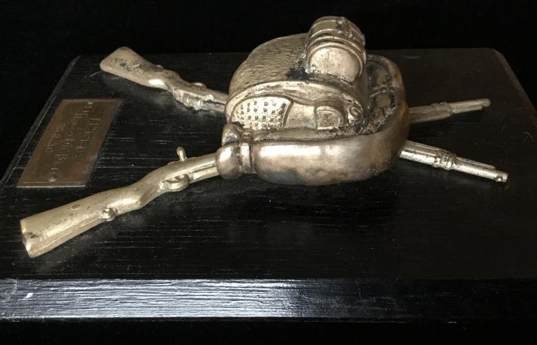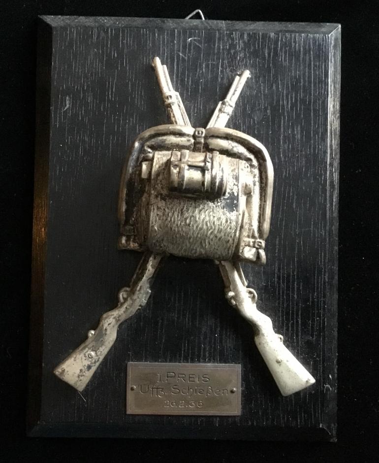 I bought this ten years ago just thought it was one of the neatest wall plaque prizes I have seen for the German military. This first prize with the two K98 rifles and the full pack including the extra pair of shoes mess kit blanket and ground sheet, even the rifle has the bolt handle sticking out. The winner Ufs SchieBen won this on Feb. 26, 1936. The silver wash is coming off part of one rifle other wise it retains all the original finish. Wood block size is 8” high and 5 3/4 “ wide. The reverse has three mounting bolts and buts and one hanging hook assembly. Condition very good ++++