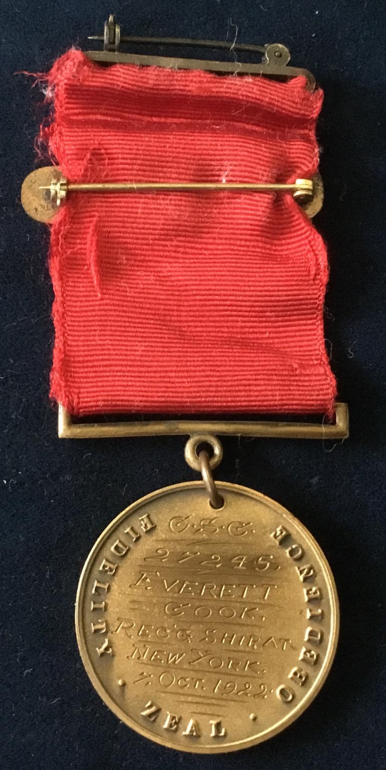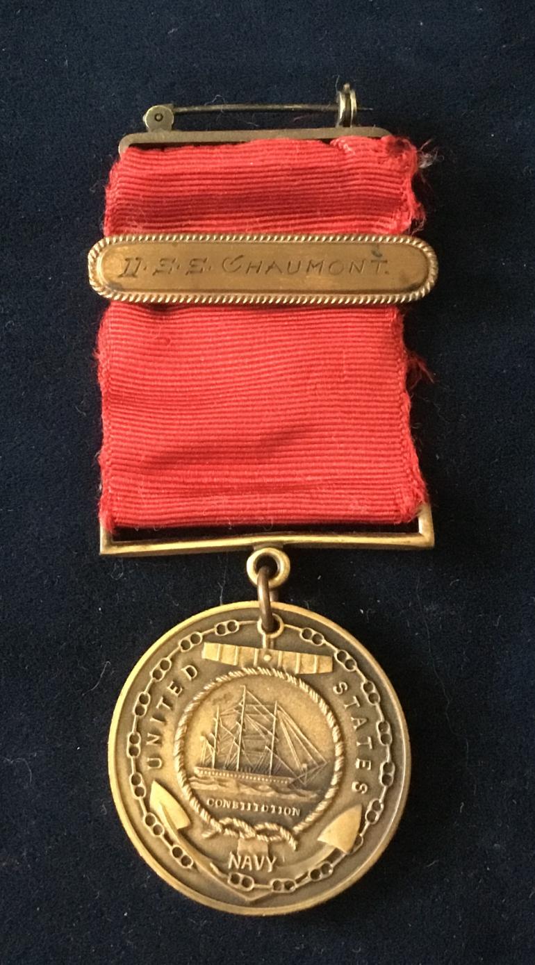 Found this on the shelf, a nicely engraved US Navy good conduct medal to Everet Cook CSC 27245 Recg Ship at New York 7, Oct.1922. The second award bat is named to the USS Chaumont a cargo shut later converted to a Hospital ship. The reverse of the bar list CSC 27245 11 Oct. 1926. The broach is a full wrapped one and the ribbon is in used condition. Just a nicely engraved and confirmed bar good conduct medal. Condition very good
