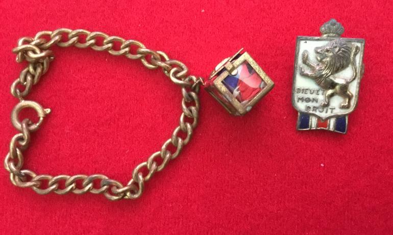 Where this stuff comes from I don’t know but there it was in a box on the shelf so here it is for you. This WWII Bundles for BRITIAN card has two hat pins on it I have seen the pins before but never the card. The bracelet is brass with a small container with a British flag in it and the cover has a crown on it like the card and says BRITIAN delivers the goods, The side has bundles for BRITIAN inc and the other three sides are clear plastic to see the flag. The third item is the common donation badge marked official and BB by accessocraft. Condition good ++