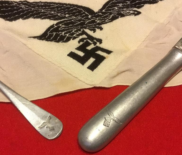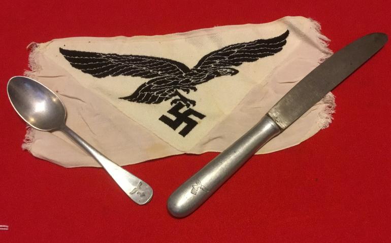 Just a small group that I put together going thru some boxes. There is an original Luft sports shirt patch, a well marked spoon and knife for the Luft service. Condition good +++
