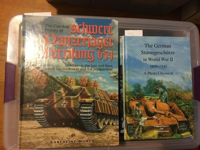 This book The Combat History of Schwere Panerjager Abteilung 654 is about their action in the East and West with the Ferdinand and the Jagpanther. This massive book is by Karlheinz Munch and is hard covered and 12" high by 9" wide and 1 1/2" thick. This reference about the above unit when it was a towed artillery unit to being converted to a armored tank destroyer unit with just the two tank destroyer models the Ferdinand and the Jagpanther. The book is a daily action report of the units involved and even list the repairs done to the various tank destroyers. This book contains 610 pages and over 750 period photographs and I have only seen a few of them before, along with 32 pages of full color drawings. If you like Stugs this is the book about the Jagpanther and the granddaddy of them all the Ferdinand. I have never seen a book so thorough in its unit history and the tremendous amount of original photographs.