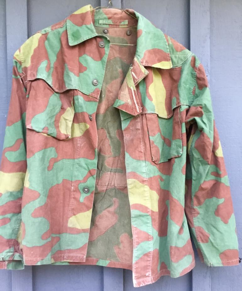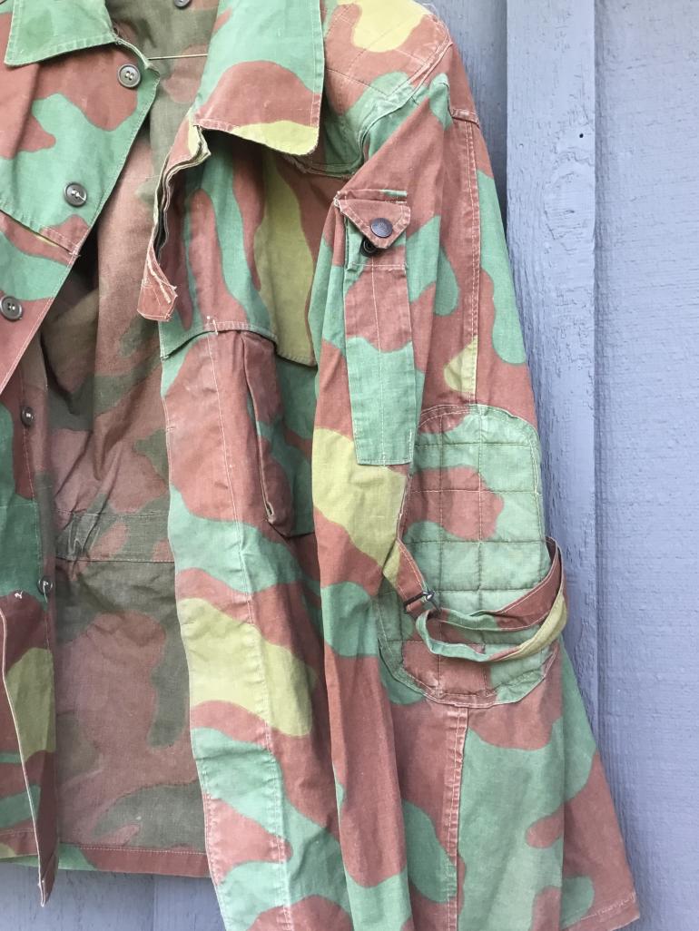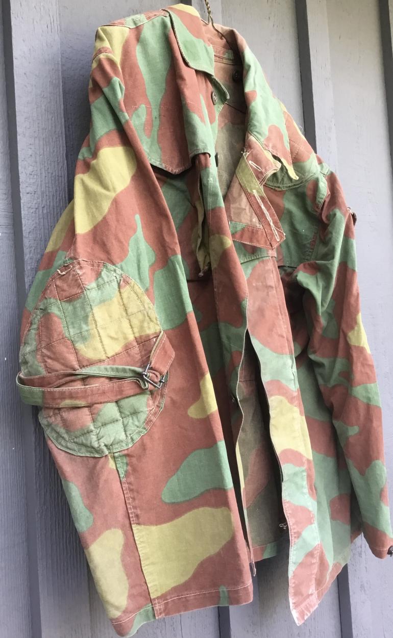 This jacket is like the typical German used items but this one has some modifications to it. The front breast pockets have a scalloped cover over the pocket flap there is a arm pocket for a pen each sleeve has a draw strap by the elbow padding, and there are extra padding on the shoulder area for the load bearing equipment straps. Different but neat. Condition heavily used but in good condition
