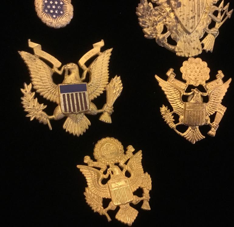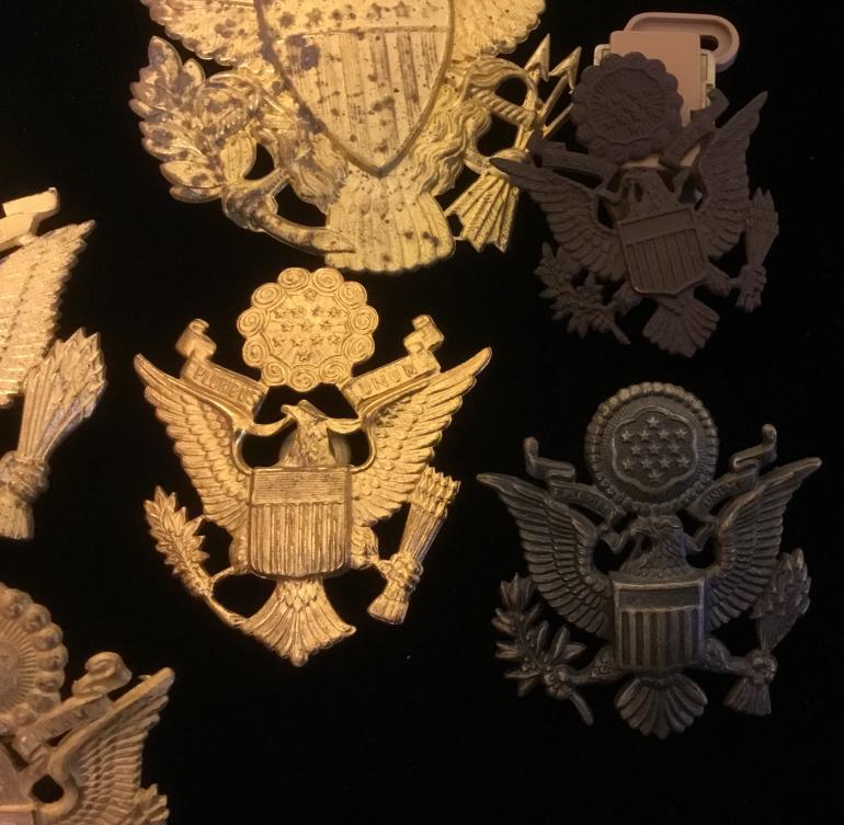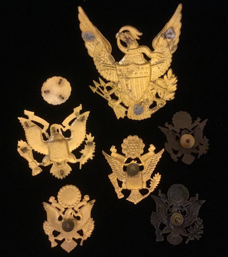 This group of mostly Officers cap badges consist of A/ Mid 1800’s Federal and State shako brass eagle, B/ Something that I have never seen before its a eergated set of the eagle and wreath in heavy medal almost twice the size of the normal Officers Eagle emblem and it has loops on the reverse tomount to whatever C/ a very nice eagle that is bent on the tail feathers to fit the cap and is with a great frosted finish, the tip of the wings have a small sharp projection to keep it from turning. D/ This next one is bright brass and shows the variations that were made by the different companies E/ This one is a nice WWI Officers eagle with the top wreath bent out to accommodate the visor cap F/ This appears to be an early US Air Force Eagle with the burnished silver finish. All are derived from the original 800’s eagle with out the savors and the shield is different. Note all eagles have mounting stems and nuts or are with loops to sew or hold on with leather strips.Conditions very good