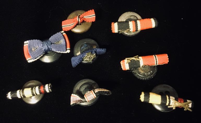 This little group of Button Ribbons is something that I have added to over the years just something to do when I purchased lots of material from vets. There are seven button hole ribbon’s for wear on civilian clothing including WWI and WWII period. The best one has a Eagle Order Ribbon on it the only one that i had found. There is the Russian front , war merit with swords, faithful service with cross, luctschultz, and two WWI ribbons.Some are on actual buttons and some on specially made holders. Just a neat group. Condition very good ++