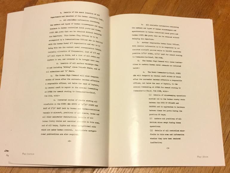 I purchase the two US National Archives booklets many years ago just seemed a natural thing to read and own as a militaristic collector of that period. The booklets are with a heavy paper cover 8”W x 10”H and the German documents have many more pages than the Japanese booklet. What surprised me is the German surrender documents spends most of the pages discribing the surrender of ships and dismantling of the sea mines, and the submarines to render the torpedoes inoperable by removing the pistols and the deck gun to toss the breech lock along with all ammunition. There just seems too much about Navay ships than land forces. The Japanese one tells them that they are —— — — ed. Anyway both are interesting reading especially the Japanese characters. Condition very good.