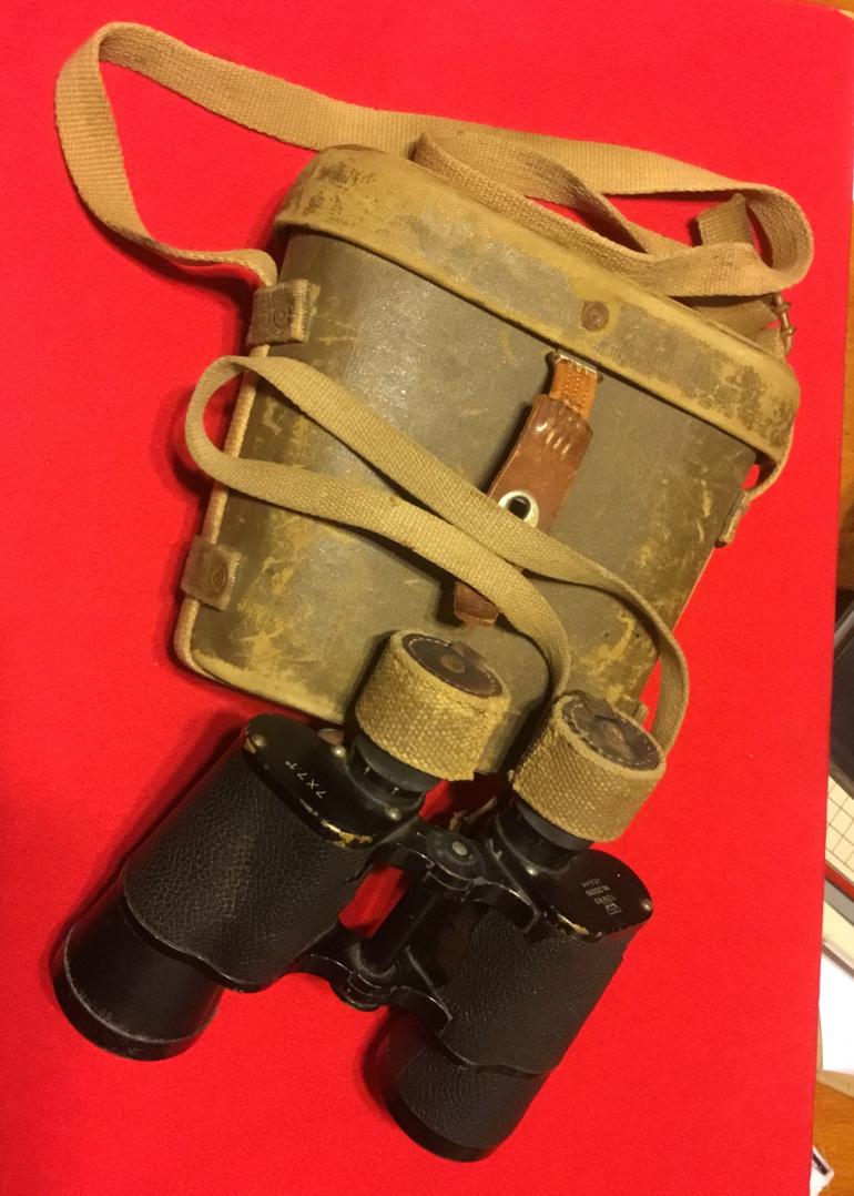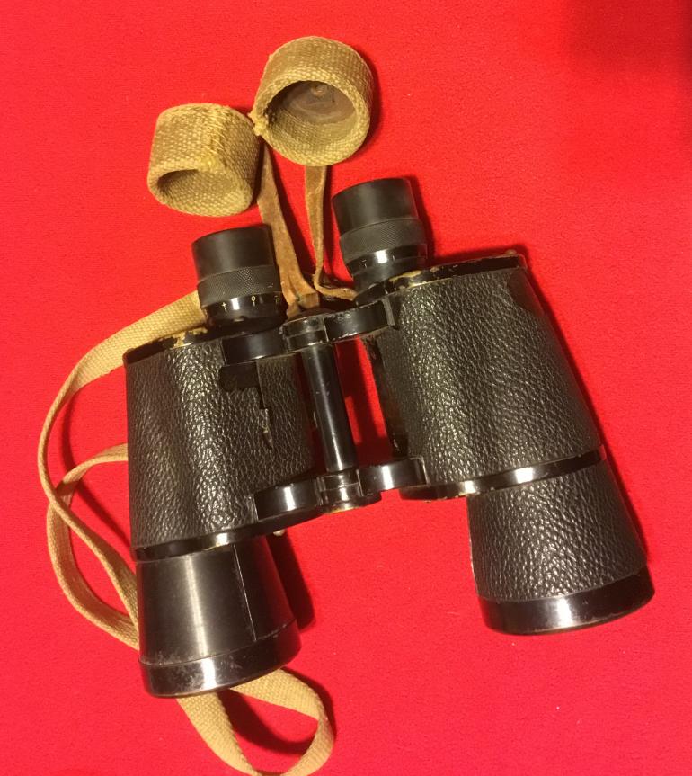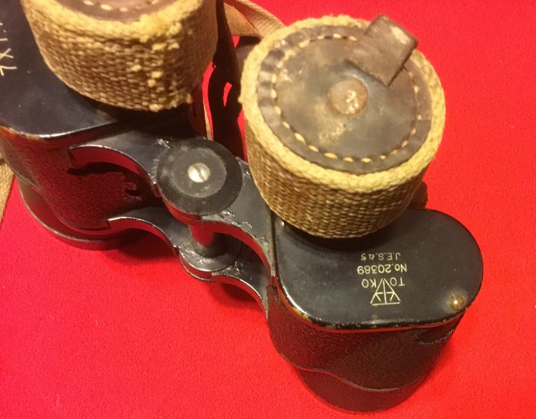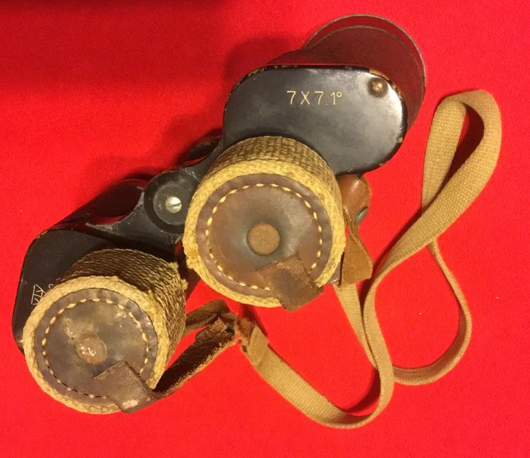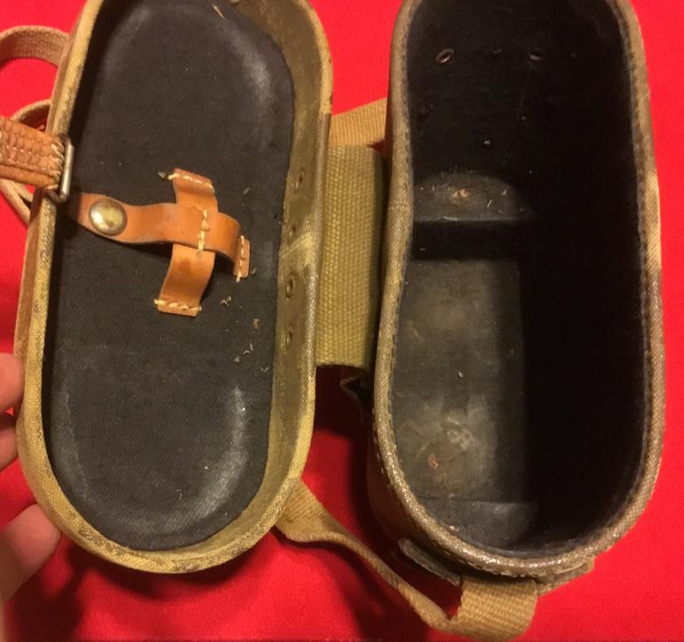 This is another great set of WW2 Japanese binoculars with the case. What I like is that they are the larger size and this is the first pair that I have had with the lenses cap covers made from heavy canvas. The internal lenses need cleaning as they have that yellow cloud effect when looking thru them. The right lenses has the measured adjusting cross scale. All the adjustment is in the individual eyepieces lenses adjustment. Both case and binoculars have the complete original straps, make a great display Condition good +++