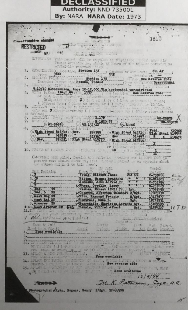 This is a complete set to include the Purple Heart and President Accolade document. Both have been glued to a hard paper backing for a display. The Purple Heart document for First Lieutenant William J. Young A.S.N. 0-753266 list him as Killed in Action September 18th, 1945. What is intriguing about this set of documents is the date of death on the PH document is incorrect. According to the Missing Air Crew Report Lt Young was the pilot of a B17-F on a bombing mission going to Poznan, Poland, and was last seen near in the vicinity of Bornhelm Island, off Sweden. Lt. Young’s bomber was shot down April 11th, 1944 by German aircraft. There was only one crew member who survived out of a crew of 10 men and he was picked up by a German Patrol Boat. Lt. Young’s plane serial number was 42-29939 from the 8th Air Force 96th Group 338 Squadron. I have purchased quite a few paper groupings like this from veteran’s families or relatives where the vet was buried with the medal or some one in the family took it years ago. The incorrect dat on the PH document most likely the time it took for the information to work its way to the awards division. Condition very good+++