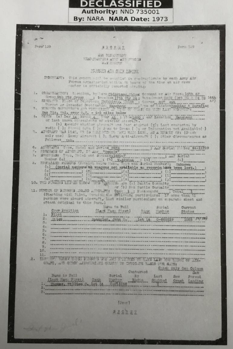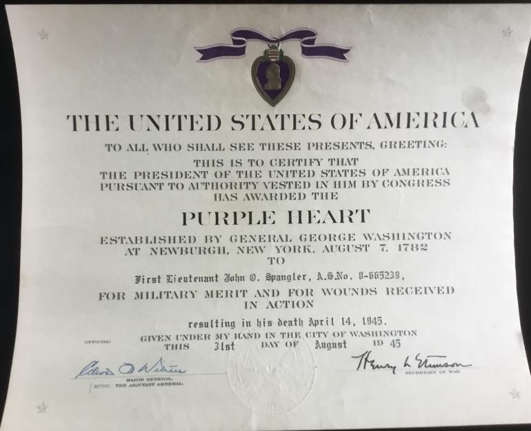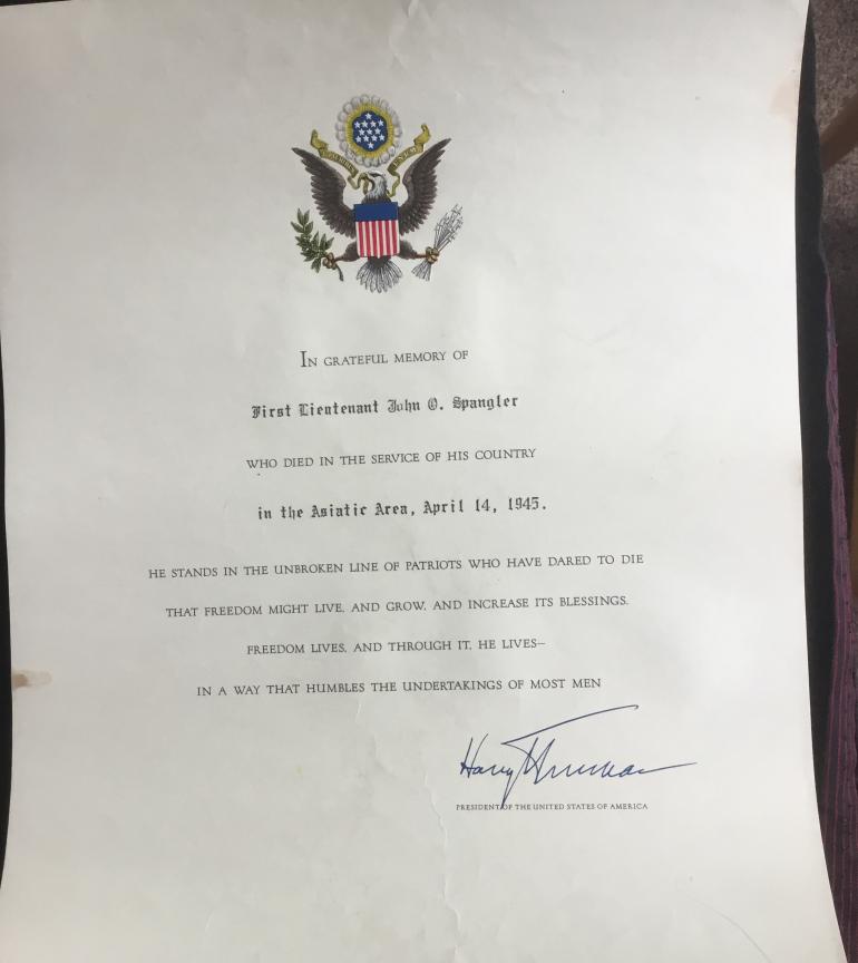 This is an interesting group to a fighter Pilot serving in China. First Lieutenant John C. Spangler serial number 0-665239 of the 14th Air Force 4th Fighter Group 17th Fighter Squadron. The mission he was lost on was to Nanchang on April 14th, 1945 for a bombing and strafing mission where he was lost to unknown causes. His fighter plane was a F6KS serial number 44-11919 nicknamed “Connie”. Included in the set is the Purple Heart and President Accolade documents and the front page of the missing air crew report. Condition very good+