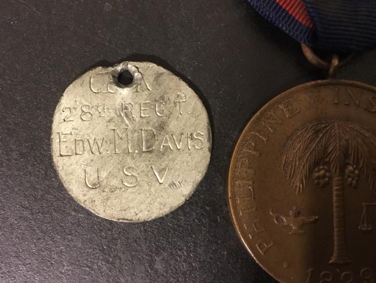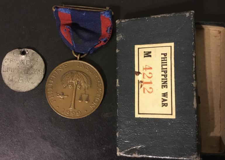 This Philippine Insurrection medal is numbered M. No.4212 and comes with a ID tag listing Co. K 28th Regt. Edw. M. Davis along with the original numbered cardboard case. I purchased this medal some time ago because I thought that I could trace the owner thru the tag and confirm that he served in the P.I. To earn this medal.
