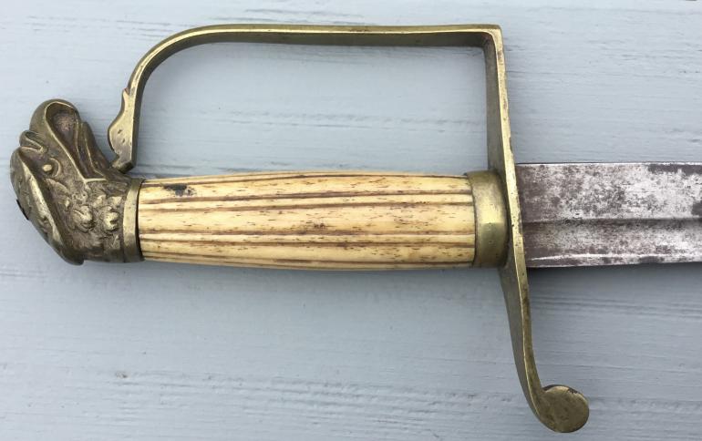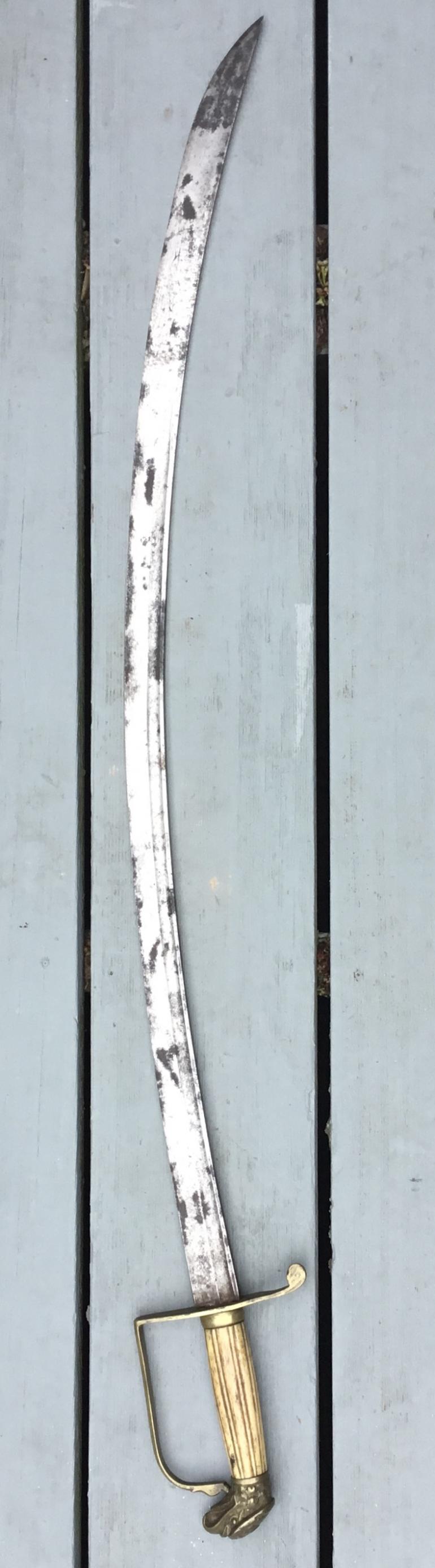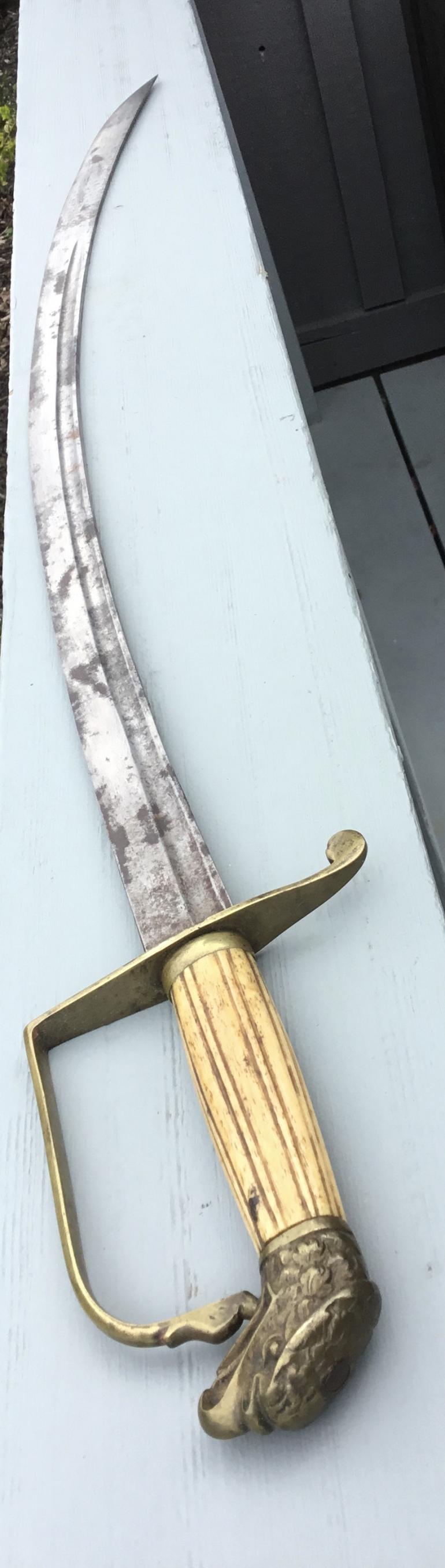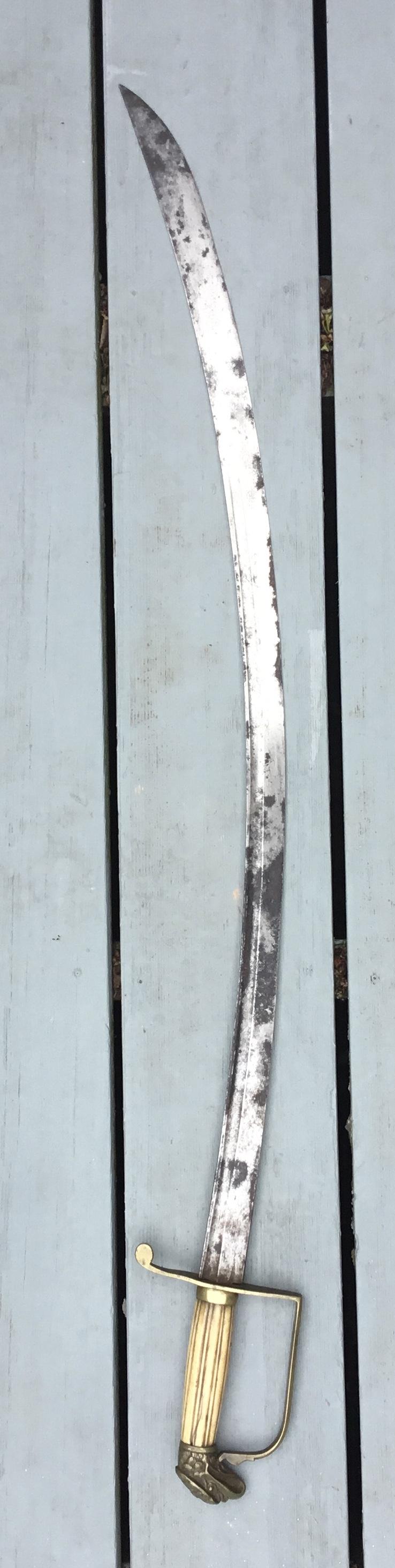 This early Mounted Artillery Officers Sword from around 1815 till 1840 period is my favorite period of collecting American Swords. I believe that this sword is English made for the american market for the following reasons. It matches up exactly with sword 41b from the Philip Medicus collection with the curved blade length of 31” the fuller is 21 1/2” there are no maker marks and the blade is plain. The guard is plain brass that was most likely gilded at one time. The grip is made from a bone with vertical fluted lines with one narrow space to one wider space devising the fluted finish, there is one short crack and with the leather washer missing between the sword and guard somewhat lose. The blade has dark rust spots but has not been played with as there are no nicks in the blade edge, and it is still sharp.