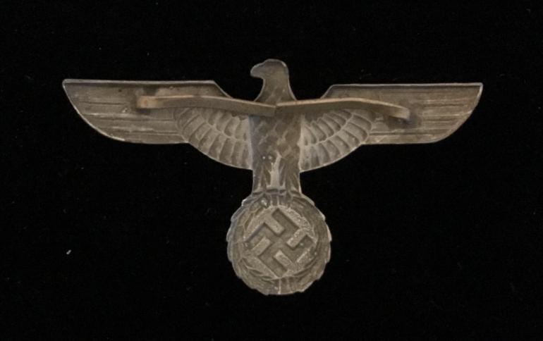 This first style Army Visor Cap Badge has a two inch wing span and does not have that three dimensional appearance of the later eagles. The eagle is more attractive to me than the replacement it looks like the Railway car eagles. The wreath and swaz are larger as are the height of the wings. Both prongs are present.