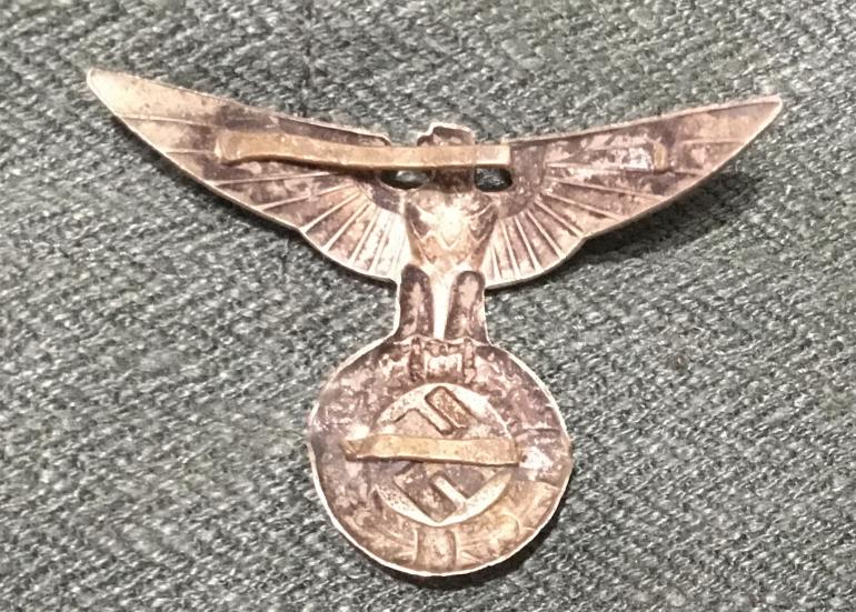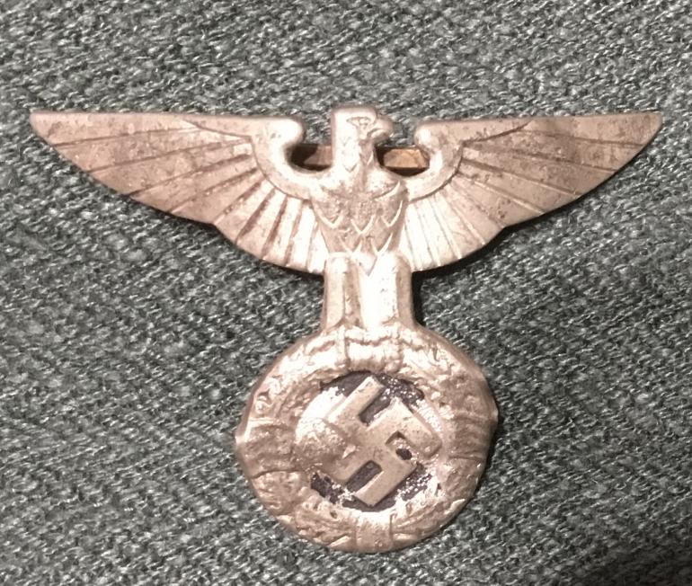 This 1927 pattern cap eagle is one of my favorite visor cap eagles, just has that Art Deco look from that period. The wing span is 1 7/8” with a 1 1/4”height.