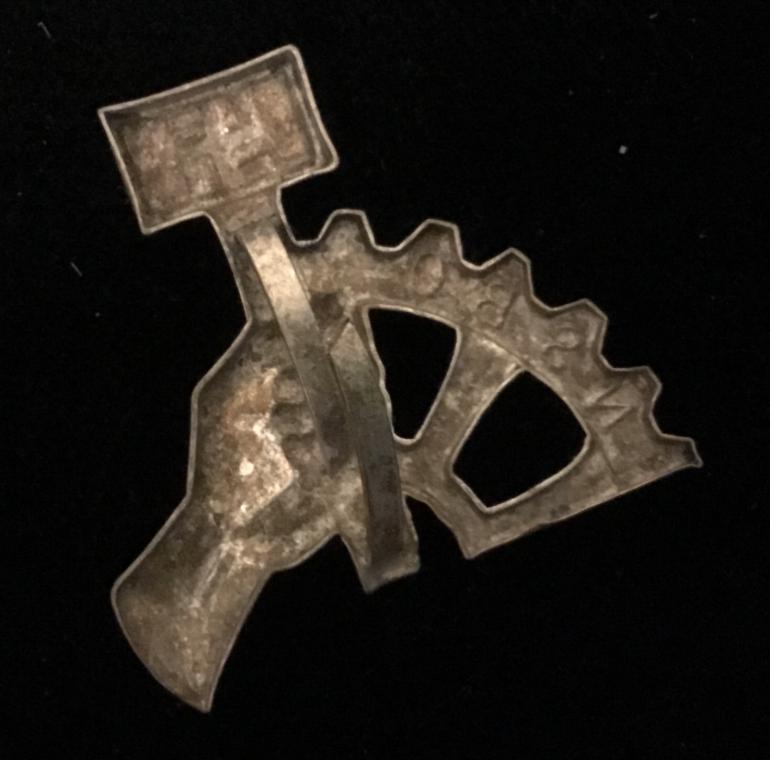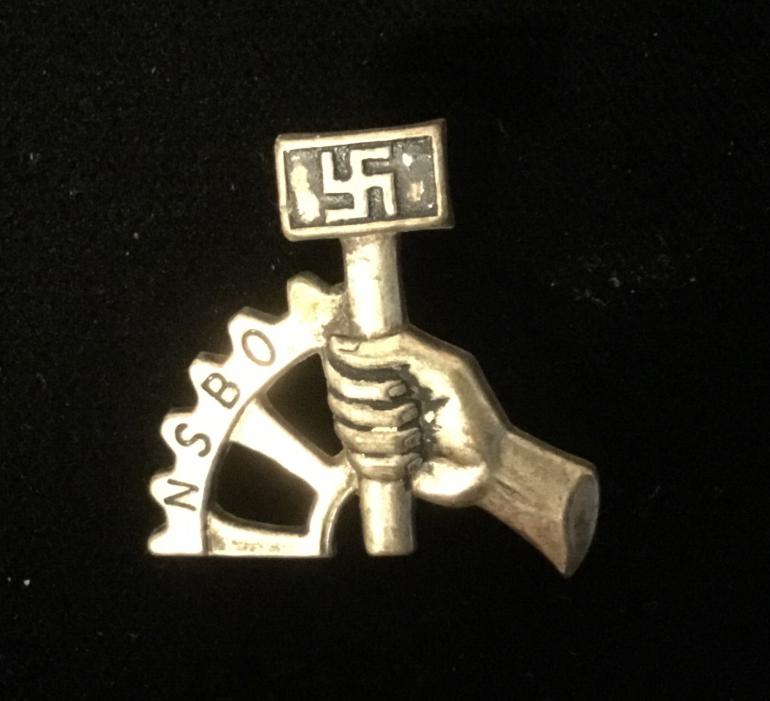 This NSBO is one of the smaller cap badges measuring just over 1” high. The construction is typical die struck light weight metal. The letters and most of the swaz background still have the black paint. The reverse has the two prong bars to mount the insignia.