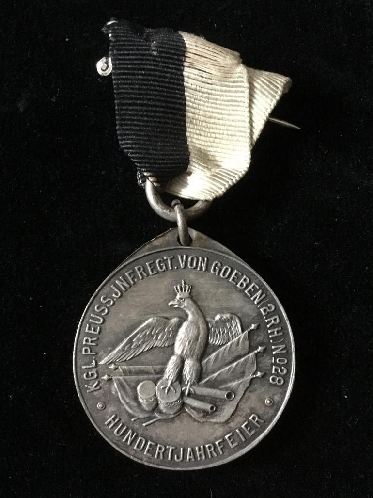 This Silver medal celebrating 100 years of service for the Regt. Von Goeben 2. Rh. No, 2 is with the original ribbon and mounting pin and catch. Condition very good ++++