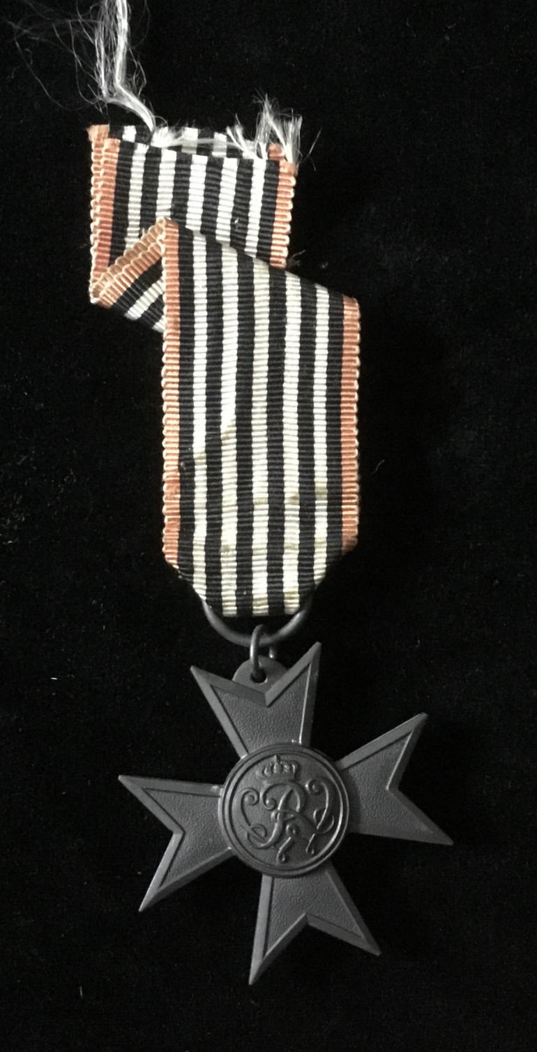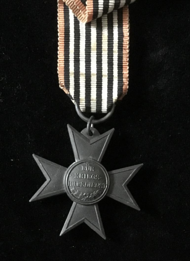 This Prussian war helper and aid worker service cross bearing the cipher of King Wilhelm II was instituted in December 1916 as an award for outstanding patriotic war aid service regardless of rank or status. The cross is blacked Kriegsmetall alloy cross size is 1 5/8: x 1 5/8” and comes with a full ribbon.