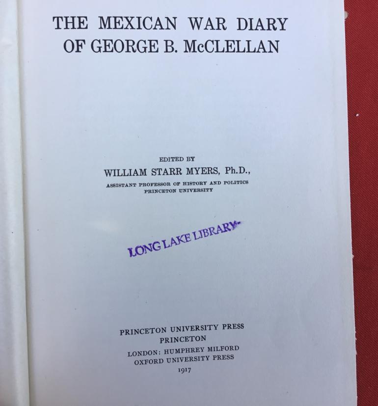 The book was edited by William Starr Myers and on the first page is a dedication “Presented by Wm Starr Myers June 27 1932” the next page has an early photo of McClellan as a Lt. And his father an younger brother dressed as a girl with a bonnet and long hair which was the custom at that time. The book is interesting and to be honest like most military collector's I know little about our little war with Mexico other than the outcome. Just finished a book on William Tecumseh Sherman who missed the Mexican war and was afraid that he would never go any place in the army. the book has 98 pages of heavy stock paper, and was a former Long Lake Library Book. The card for taking the book out only had two entries one in 1960 and the other 1997. I think that there more letters in the book title than live at long lake.