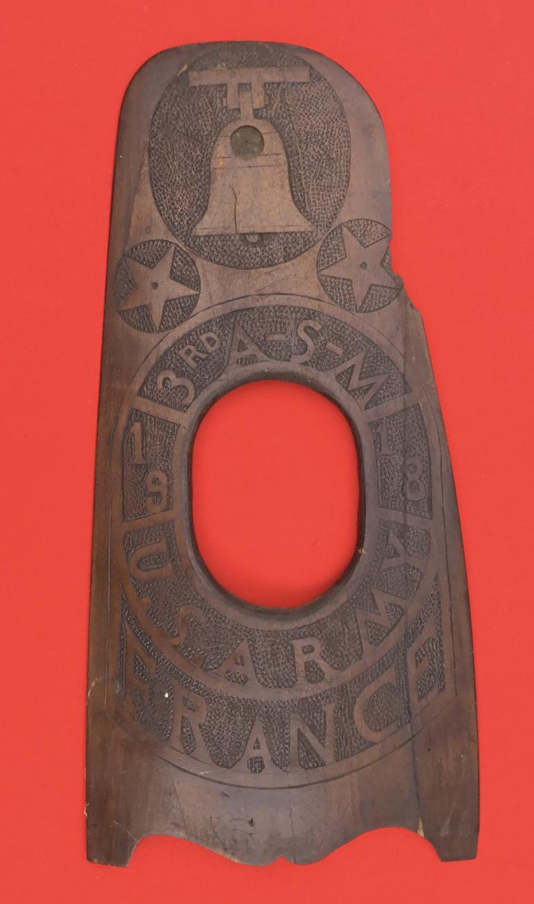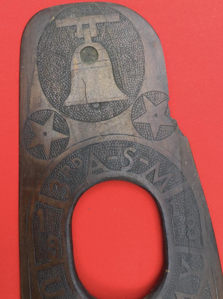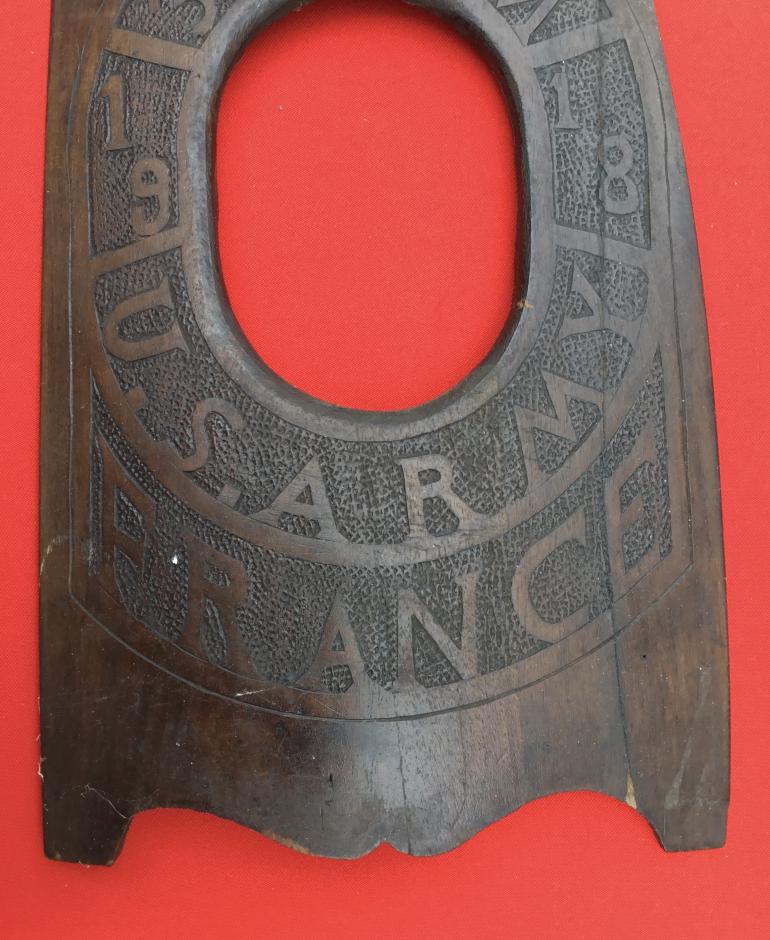 This World War Photo Frame made from a damaged propeller, and this one is extensively embellished using an X stamp and small dots on the smaller parts. This particular frame is one of the most highly worked props that I have seen or owned. To describe this frame I will start from the top as it shows the liberty bell with two Air Service stars underneath it. Within the wide border that circles around the actual opening for the photo,is highly decorated with the following. Top of the oval 3rd A-S-M and under that the date 19 on one side and 18 on the other side of the border. Below that is U.S. ARMY and below that is FRANCE. The reverse is plain. It must have taken an extensive amount of time and patience to produce this frame. The overall frame has a dark monologue finish to the wood, and on the reverse you can see the wooden pegs used to hold the various pieces of wood that make up the propeller. There is a section of wood missing on the right side but it appears this is what they had to work with. The size is 17” high and 8.5” wide at the bottom. This is another item that was on display in my room and never for sale. It was purchased in the mid 70’s.