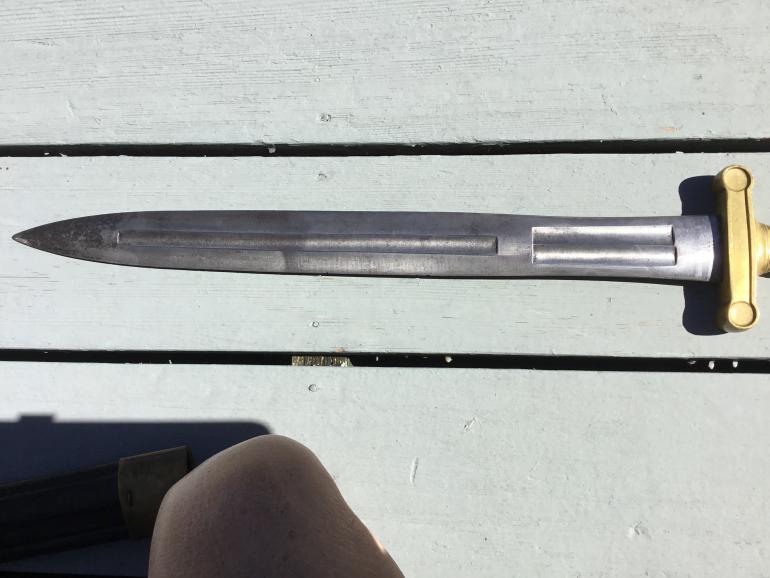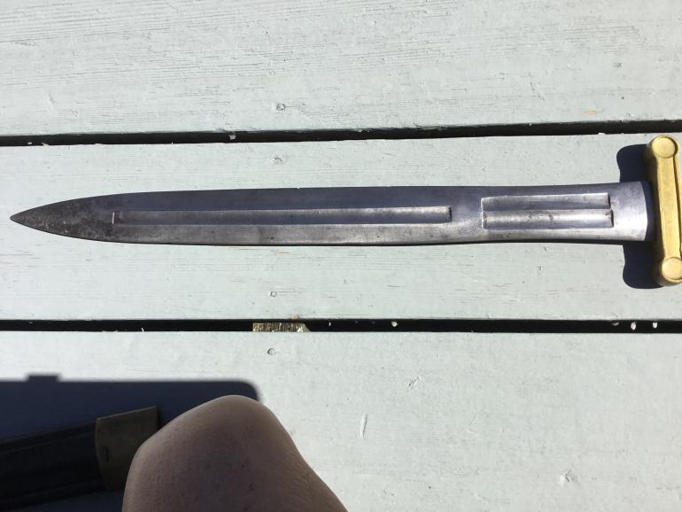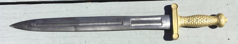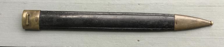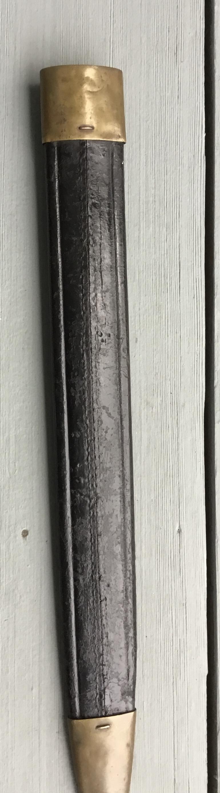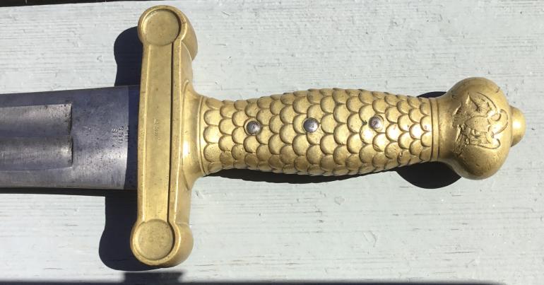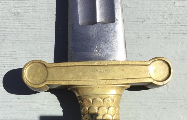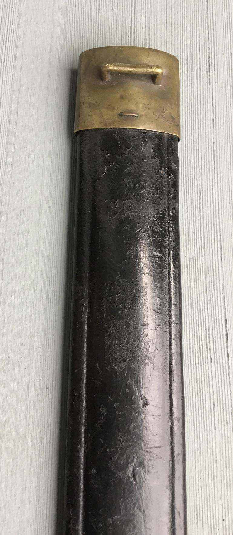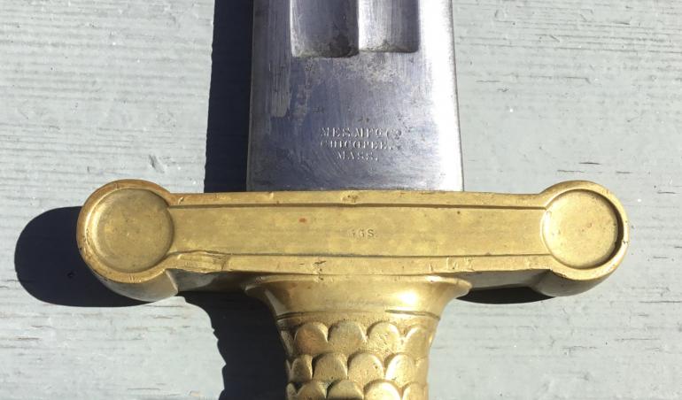Here is another sword from my collection The infamous Foot Artillery Sword, one of the first things to be thrown away on a long march. This totally useless sword was once again copied after a French sword. This sword was manufactured by the Ames Manufacturing Co. of Chicopee Mass. This is an extremely heavy sword for it size the grip, cross guard, and pommel are all one piece. The cross guard has three script initials WAT for William Anderson Thorntons. The reverse side of the cross guard has the inspectors initials GGS. The grip unit is cast with what looks like eagle feathers with a US style eagle case into both sides of the pommel. the grip has three rivets holding the blade to the grip. The blade is 19” long with two broad fullers. The Ricasso has the Ames MFG. Co and Chicopee Mass and the reverse side is stamped US over GGS and under that the date 1855. The blade has no nicks and shows rust had formed on the last 2” of the end of the blade and cleaned off. The scabbard is made of leather with the two embossed lines and instead of a frog Stud has a half rectangle to accept a leather strap as was the French style. Having discussed the scabbard with several collectors the though was that this was a state militia sword. The Horstmann also made scabbards in this manor.